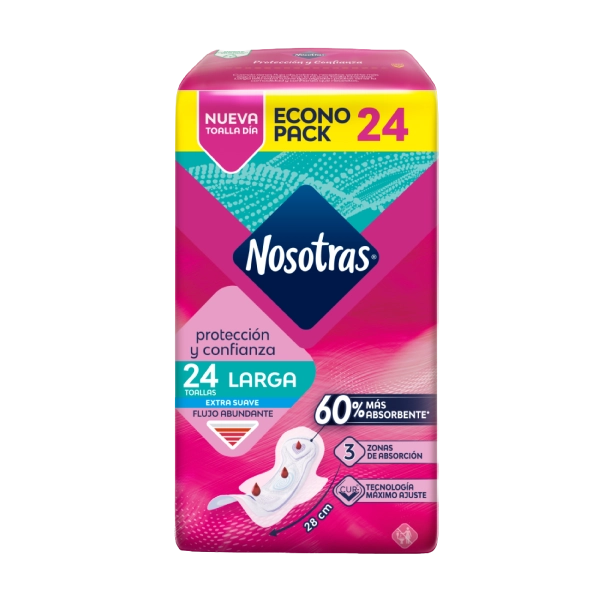 Toalla Nosotras Larga de Día Ultra Delgada para flujo abundante. Absorbe 60% más que una toalla normal y mide 28 cm, brindando mayor seguridad y comodidad en días de flujo intenso.